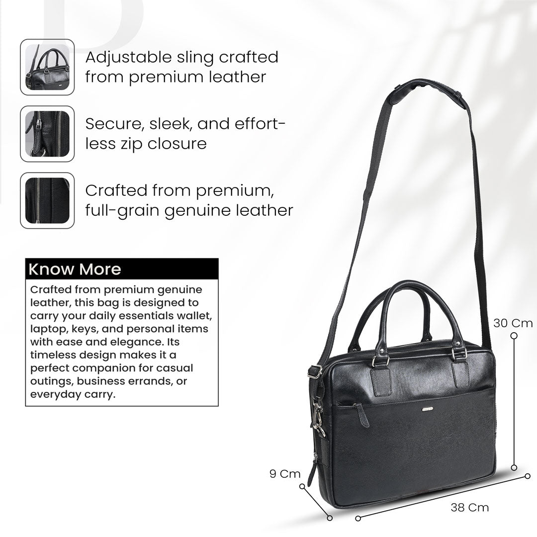 This sleek black leather bag is thoughtfully designed with multiple compartments, smooth YKK zippers, and an adjustable sling strap for maximum comfort. Whether you’re heading to the office, attending a client meeting, or catching a flight, the Bagsity Signature Bag ensures you always carry your essentials in style.